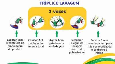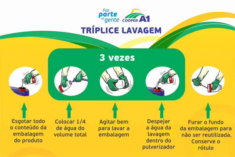 O engenheiro agrônomo da Cooper A1, Celiomar Jose Crestani, da unidade de Itapiranga, afirma que, para receber as embalagens e atender a legislação, alguns passos devem ser seguidos pelos produtores, afim de evitar complicações. “As embalagens devem ser tríplice lavadas, processo de enxaguar três vezes a embalagem vazia”, explica. Critérios que devem ser seguidos:- Após esvaziar a embalagem, deve ser colocada água limpa até ¼ de seu volume (25%);