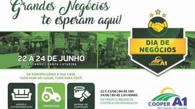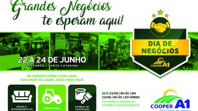 O acesso a produtos, novidades, promoções, tecnologia e conhecimento em um único lugar já tem data marcada. O 10º Dia de Negócios da Cooper A1 será nos dias 22, 23 e 24 de junho, em Descanso, SC. Na feira estarão expostos centenas de produtos que a cooperativa disponibiliza hoje em sua rede de lojas. O Dia de Negócios, vai envolver desde as linhas agropecuária, máquinas e implementos, nutrição animal, até materiais de construção, eletrodomésticos, eletrônicos e móveis.