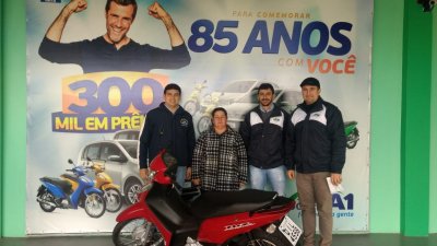 Na última quinta-feira, dia 7, a sexta moto 0 km da “PROMOÇÃO 300 MIL EM PRÊMIOS PARA COMEMORAR 85 ANOS COM VOCÊ” foi entregue para Roseli Knap no município de Santa Helena, SC. O sorteio aconteceu ainda no dia 26 de maio, os papéis foram encaminhados e finalmente a entrega efetuada para Roseli.
