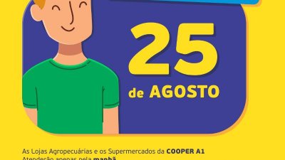 A Cooper A1 comunica a todos seus clientes e associados que neste sábado, dia 25, não haverá atendimento na parte da tarde em nenhum dos supermercados e lojas agropecuárias da cooperativa. As unidades estarão fechadas para realização do balanço, portanto, o atendimento será na parte da manhã até o meio dia.