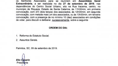 Excepcionalmente a Cooper A1 realiza Assembleia Geral Extraordinária (AGE) com o objetivo de tratar de algum projeto ou ações que necessitam de aprovação dos cooperados. No dia 27 de setembro, a cooperativa realizará no município de Riqueza, Centro Social Urbano, uma Assembleia Geral Extraordinária, a ordem do dia terá como pauta reforma no Estatuto Social e assuntos gerais.