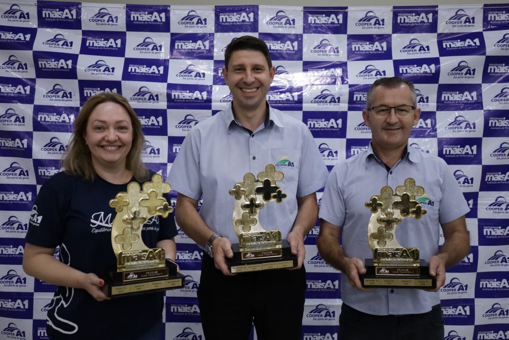 A Cooper A1 encerrou, na sexta-feira, dia 17/12, em Palmitos, o sexto ano do Programa Mais A1 – Avaliação de Performance. O evento de premiação reuniu a direção e os gerentes de atividades e unidades. Na oportunidade foram divulgadas as unidades, bem como os profissionais que se destacaram no ano de acordo com os indicadores do programa nas atividades de suínos, bovinocultura e cereais. Os números do Mais A1 em 2021, apresentados pelo 2º secretário e diretor administrativo da Cooper A1, Clovanir Ehlers, mostraram um desempenho acima da média em todas as unidades. Estes indicadores medem os resultados em vendas, recebimento de produção, inadimplência das carteiras, sobra líquida de algumas atividades, registros de visitas e atualizações cadastrais, entre outros. Clovanir também ressaltou que os objetivos do programa foram fortalecidos, principalmente no que diz respeito ao desenvolvimento das competências dos profissionais e alcance das metas estratégicas da Cooper A1. O presidente da Cooper A1, Elio Casarin salientou, em seu discurso, como o Mais A1 foi uma ferramenta determinante para os bons resultados. Segundo ele, o programa pôde contribuir ao nortear de maneira clara e objetiva os objetivos, possibilitando um desenvolvimento de maneira estruturada e sistemática de cada profissional envolvido e da Cooper A1 como um todo. Confira as unidades e profissionais premiados no Mais A1 2020 CATEGORIA UNIDADES 1º LUGAR – FREDERICO WESTPHALEN - RS 2º LUGAR – IPORÃ DO OESTE - SC 3º LUGAR – ITAPIRANGA - SC CATEGORIA TÉCNICOS SUINOCULTURA 1º LUGAR – CLEO MARCOS VERDI – TUNÁPOLIS 2º LUGAR – MAIKON MELZ – TUNÁPOLIS 3º LUGAR – GERSON LAUDIR STULP – IPORÃ DO OESTE CATEGORIA TÉCNICOS BOVINOCULTURA 1º LUGAR – MARCIONEI RICARDO MARCHIORETTO - DESCANSO 2º LUGAR – MARCIO CASANOVA – SANTA HELENA 3º LUGAR – IVAN JOSE RAMBO - ITAPIRANGA CATEGORIA TÉCNICOS CEREAIS 1º LUGAR –LEANDRO LUIS DELAVY – IPORÃ DO OESTE 2º LUGAR – NORBERTO MEURER – IPORÃ DO OESTE 3º LUGAR – DIEFERSON SCHAEFER – ITAPIRANGA