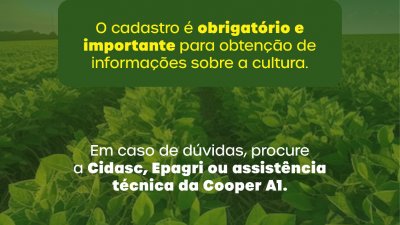Realize o cadastro das lavouras de soja através do site https://x.gd/sQB2f ou no site https://www.cidasc.sc.gov.br. O cadastro é obrigatório e importante para obtenção de informações sobre a cultura. Em caso de dúvidas, procure a Cidasc, Epagri ou assistência técnica da Cooper A1.