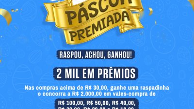 São mais de dois mil reais em vale compras de R$100,00 R$50,00, R$40,00, R$30,00, R$20,00 e R$10,00, além de prêmios em chocolates, com 150 barras de chocolates Lacta 80g e 30 ovos Páscoa Divini ao leite 190g.